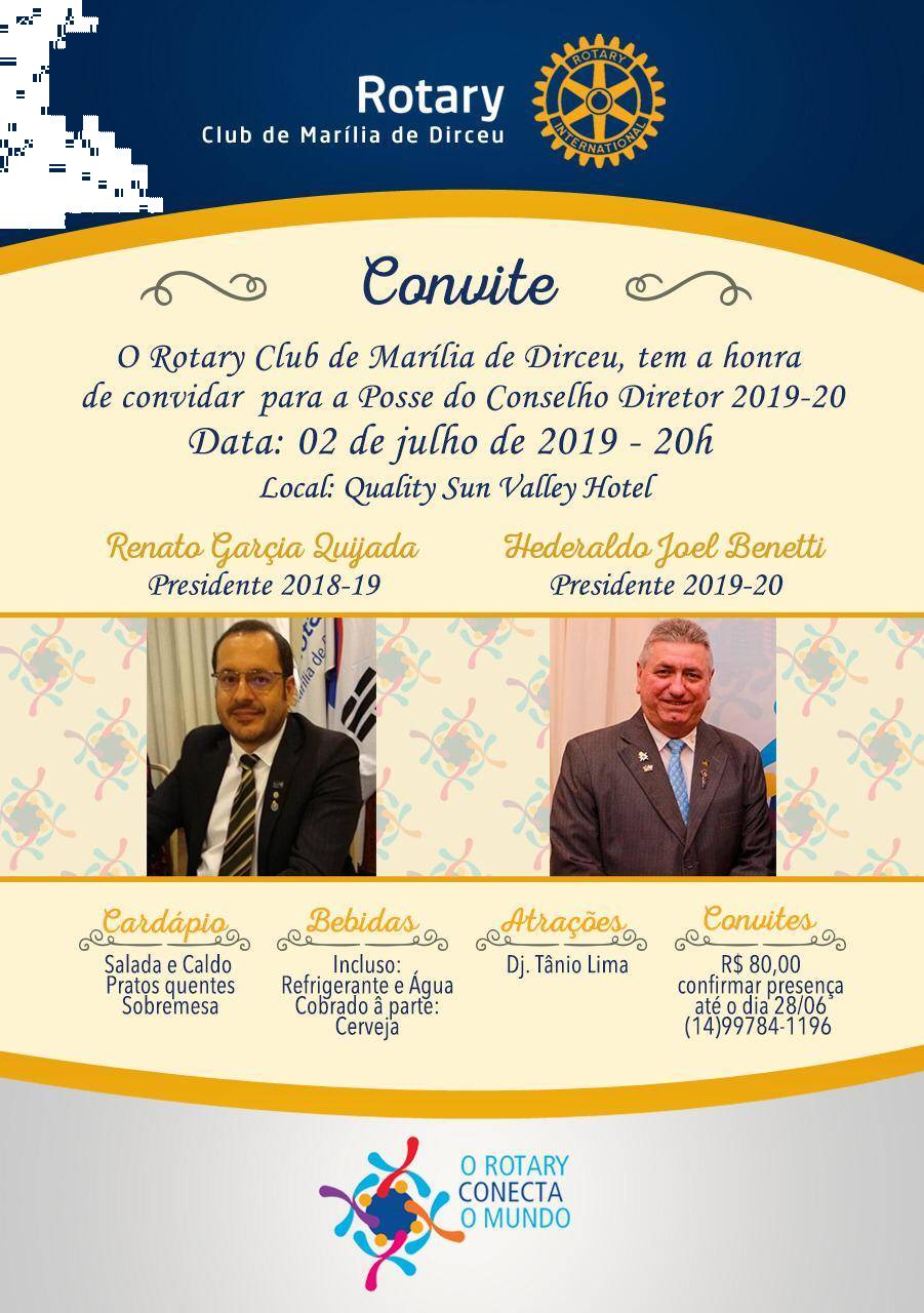 O Rotary Club de Marília de Dirceu, tem a Honra de Convidar para a Posse do Conselho Diretor 2019-20