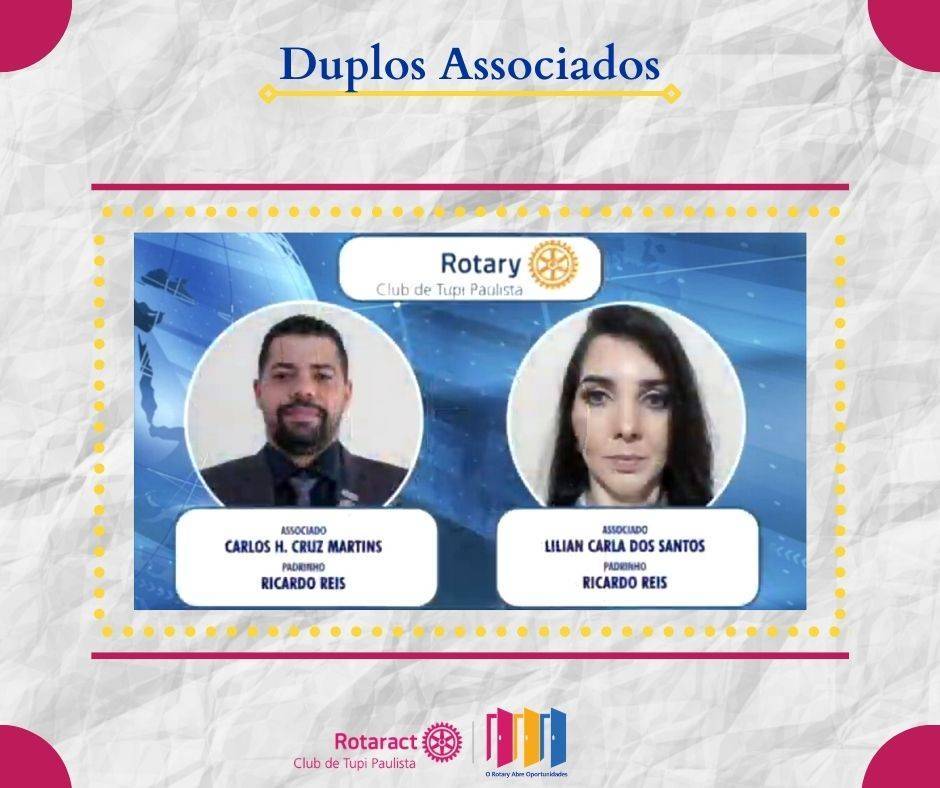 No dia 26 de fevereiro os companheiros Carlos Henrique e Lilian Carla deram um importante passo em suas vidas rotárias, agora além de associados ao Rotaract eles também são associados ao Rotary Club de Tupi de Tupi Paulista. A oficialização dessa nova etapa ocorreu durante evento online organizado pela Governadoria do Distrito 4510 para comemoração dos 116 anos do Rotary International, na ocasião outros novos associados de diversos Rotary Clubs do Distrito foram oficialmente admitidos.