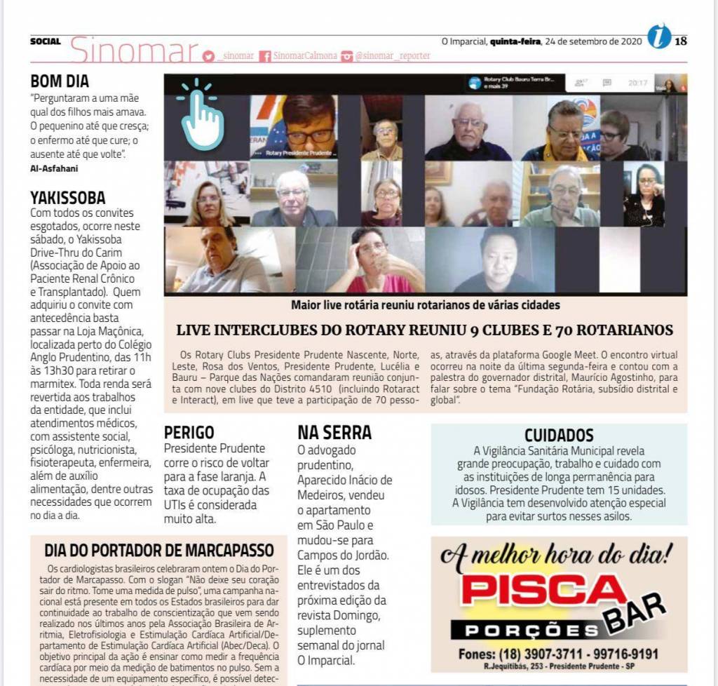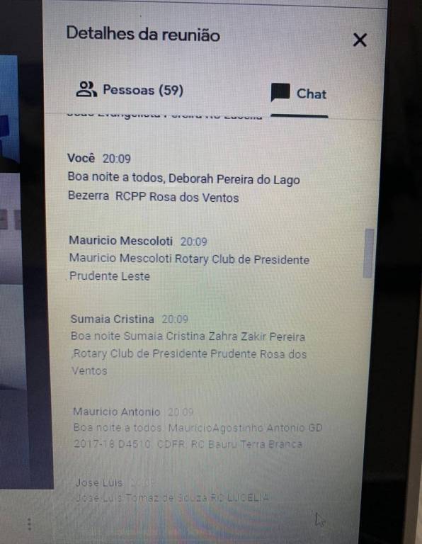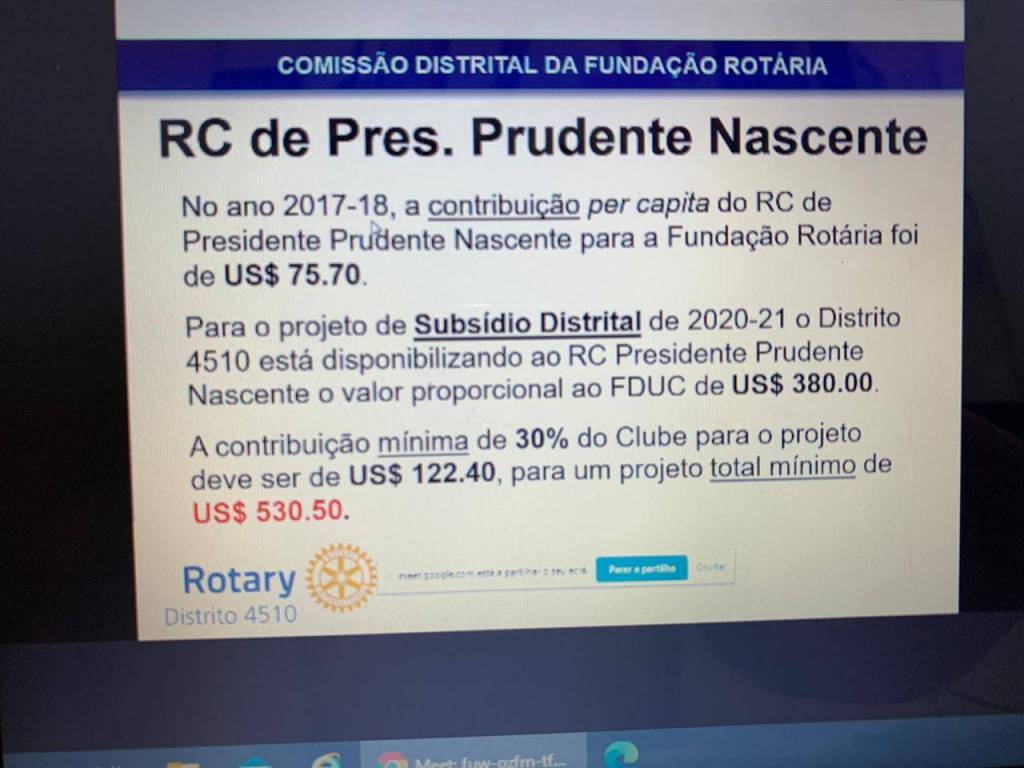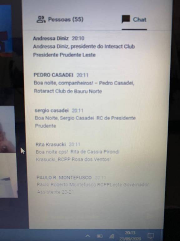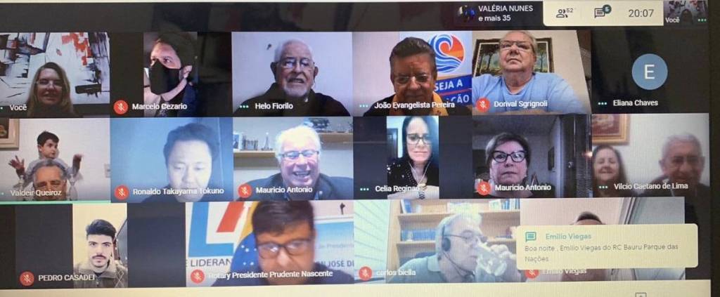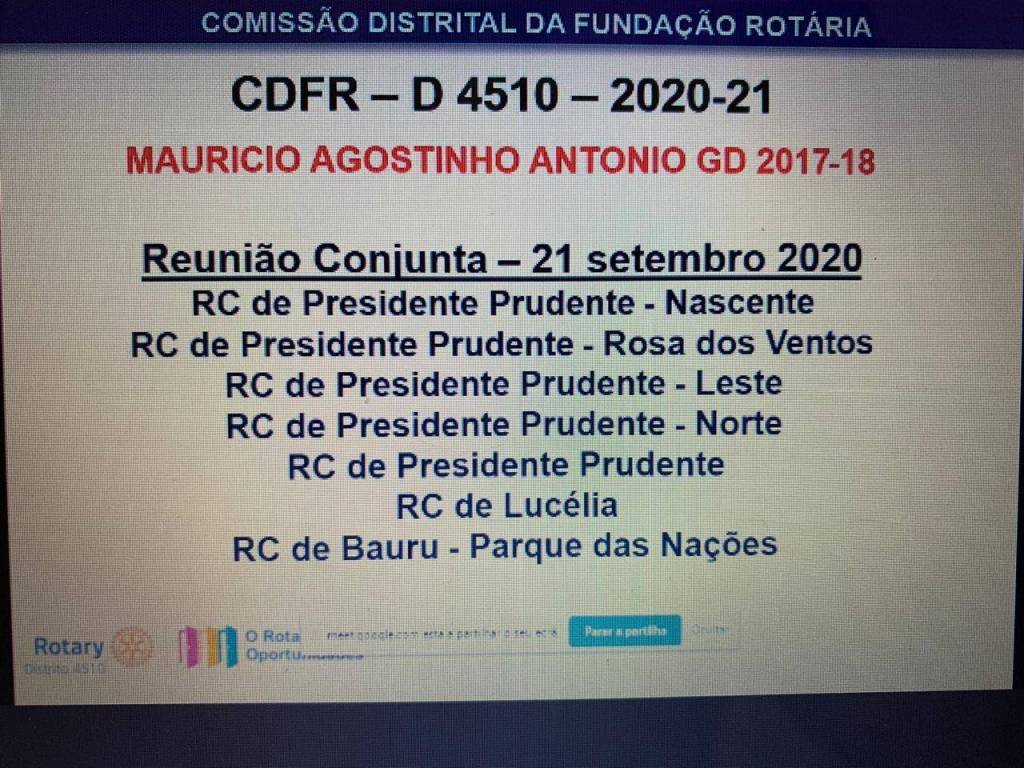 Reunião conjunta dia 21-09-20 on-line com os Rotary Clubs ; RCPP Rosa dos Ventos, RCPP Nascente, RC Presidente Prudente, RCPP Norte, RCPP Leste, RC Lucélia, RC Bauru Parque da Nações, Rotaract PP Leste, Interact PP Leste, com a palestra do Coordenador da Fundação Rotária, Gov. 2017/18 Maurício Agostinho Antonio. Foi uma palestra esclarecedora e produtiva, excelente.