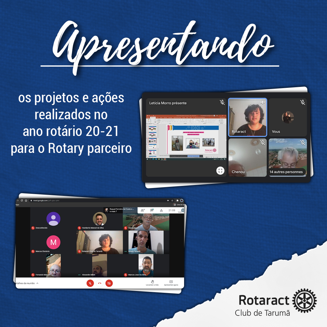 Na quarta-feira, dia 12 de maio, alguns associados do Rotaract Club de Tarumã participaram da raunião online do Rotary Club de Tarumã, onde a presidente do Rotaract, Leticia Morro, apresentou aos companheiros rotarianos todos os projetos, eventos e ações realizadas pelo clube durante a gestão 2020/21.