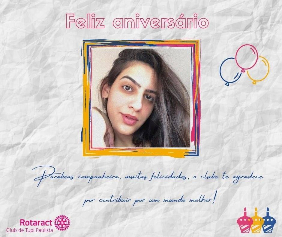 Hoje é dia da companheira e associada ao Rotaract Club de Tupi Paulista Tainá Toso. Nesta data o clube deseja um feliz aniversário cheio de coisas boas, felicidades e realizações e aproveita a oportunidade para lhe agradecer por contribuir por um mundo melhor. Feliz aniversário!