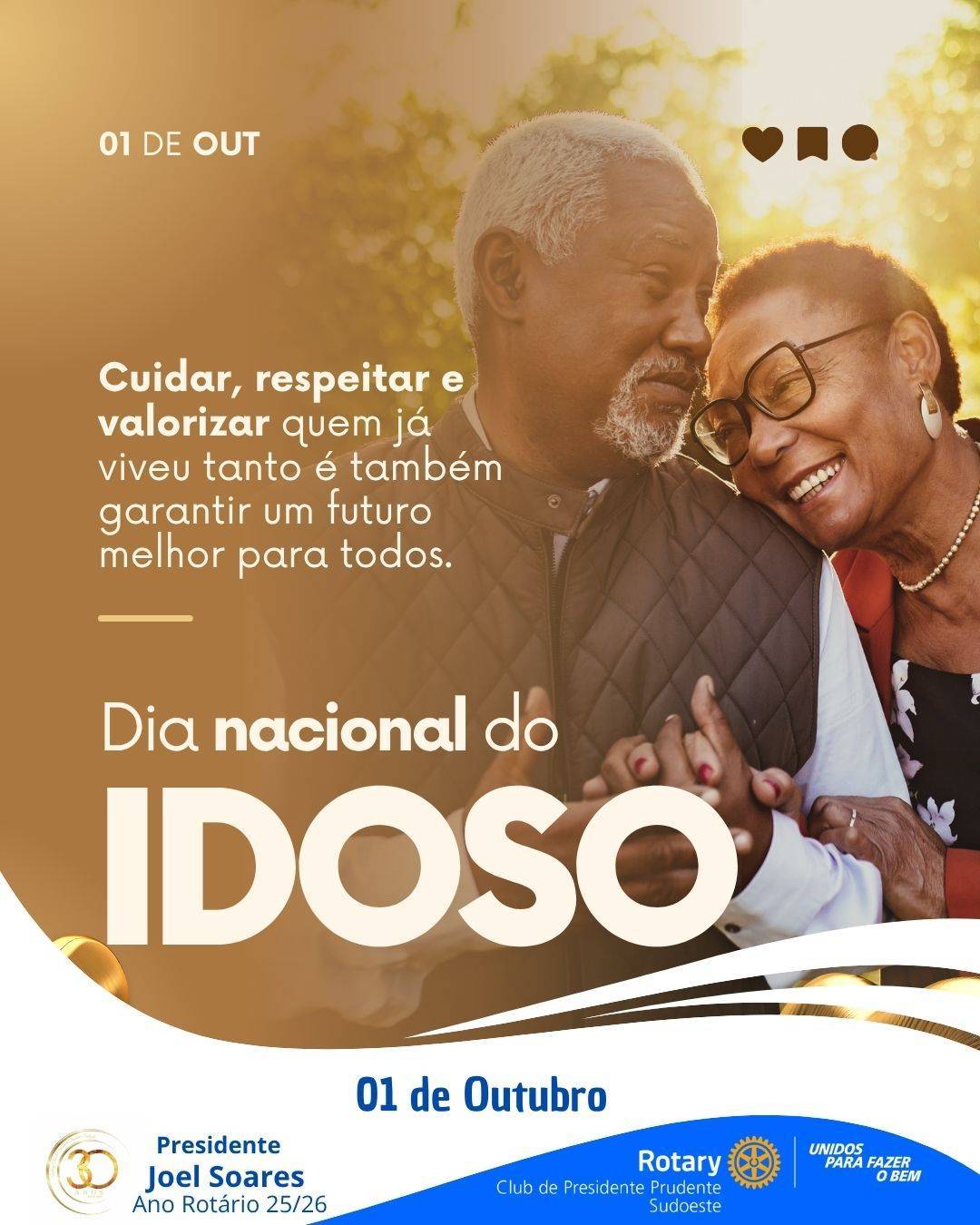 Neste 1º de outubro, o Rotary Club de Presidente Prudente Sudoeste se une à sociedade brasileira para celebrar o Dia Nacional do Idoso, uma data que reconhece a importância daqueles que carregam consigo histórias, sabedoria e afeto. Mais do que uma homenagem, é um convite à reflexão sobre o envelhecimento digno, ativo e respeitoso.